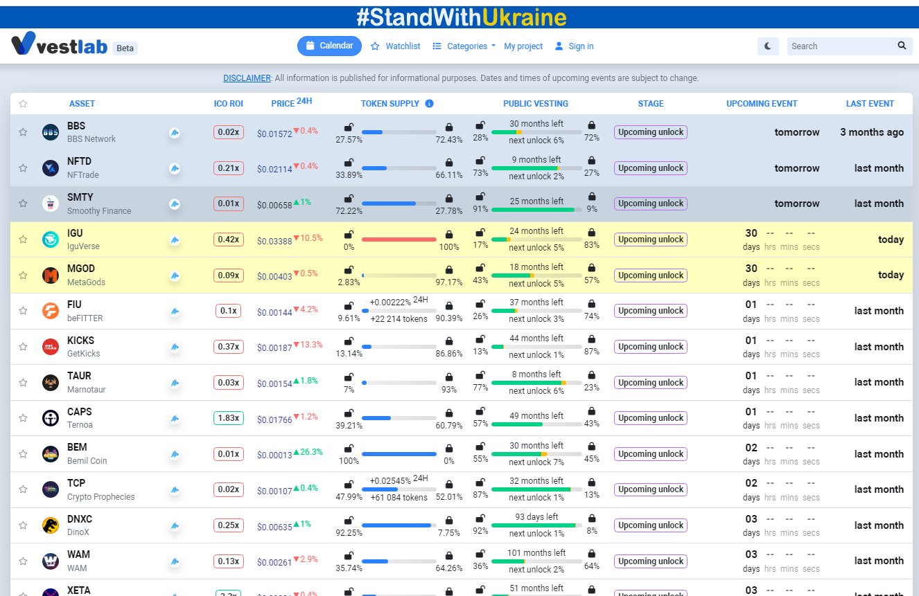 VestLab.io – 分析服务,它是关于代币经济学、指标、确切日期和时间的信息集合,即将发生的关于加密代币首次上市和归属的事件。