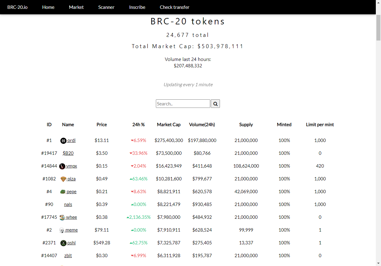 在这里您可以找到BRC20代币的所有数据。查询brc生态市值、交易量、涨幅、价格等